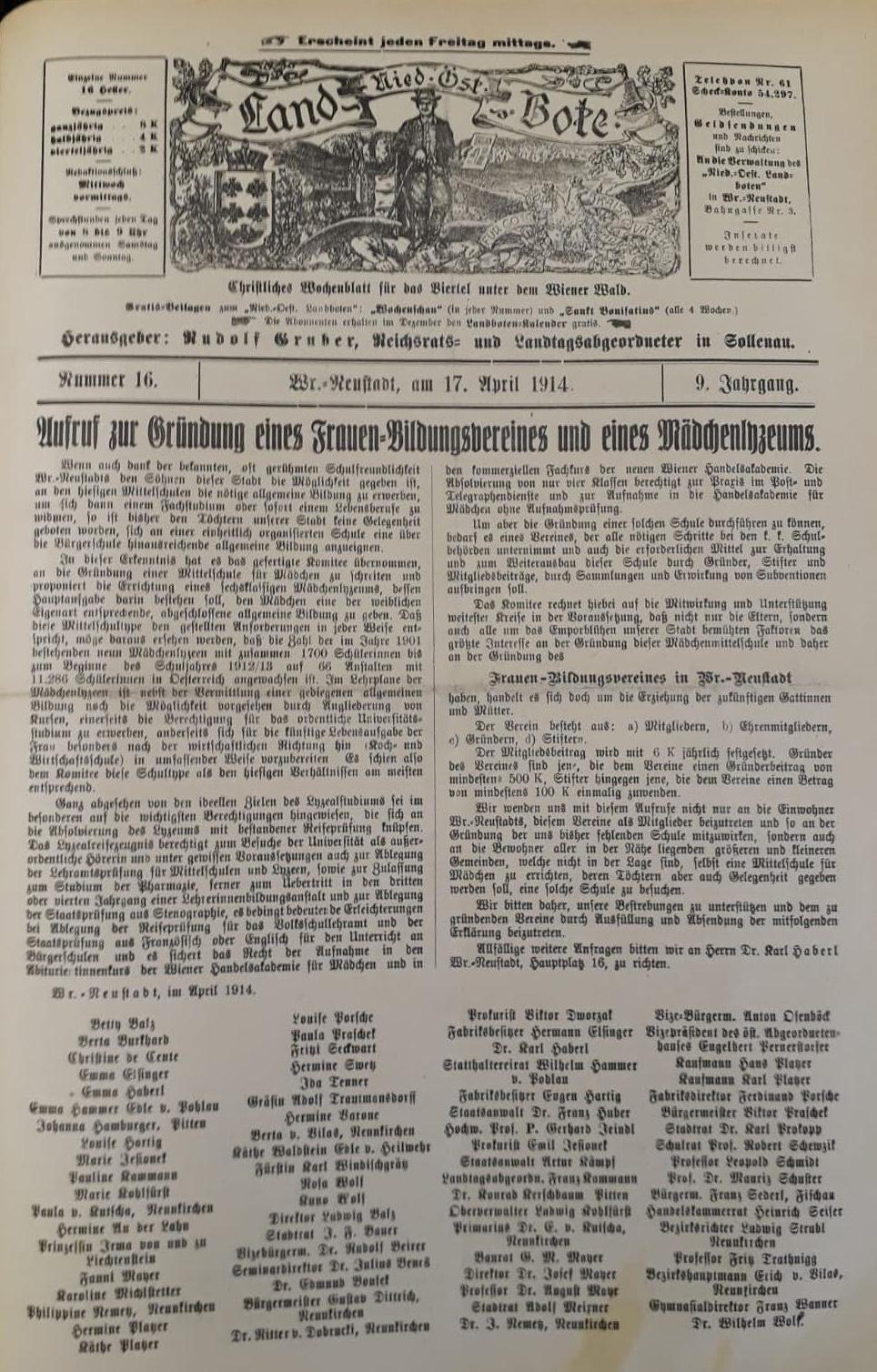 In Wiener Neustadt kommt das so: Bürgerinnen und Bürger setzen sich für die Errichtung einer höheren Mädchenschule ein. Sie veröffentlichen Anfang 1914 einen Aufruf dazu in einer Regionalzeitung.